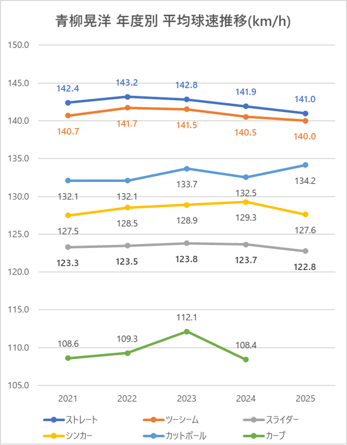 ストレートの平均球速は2024年と比較して0.9km/h低下。