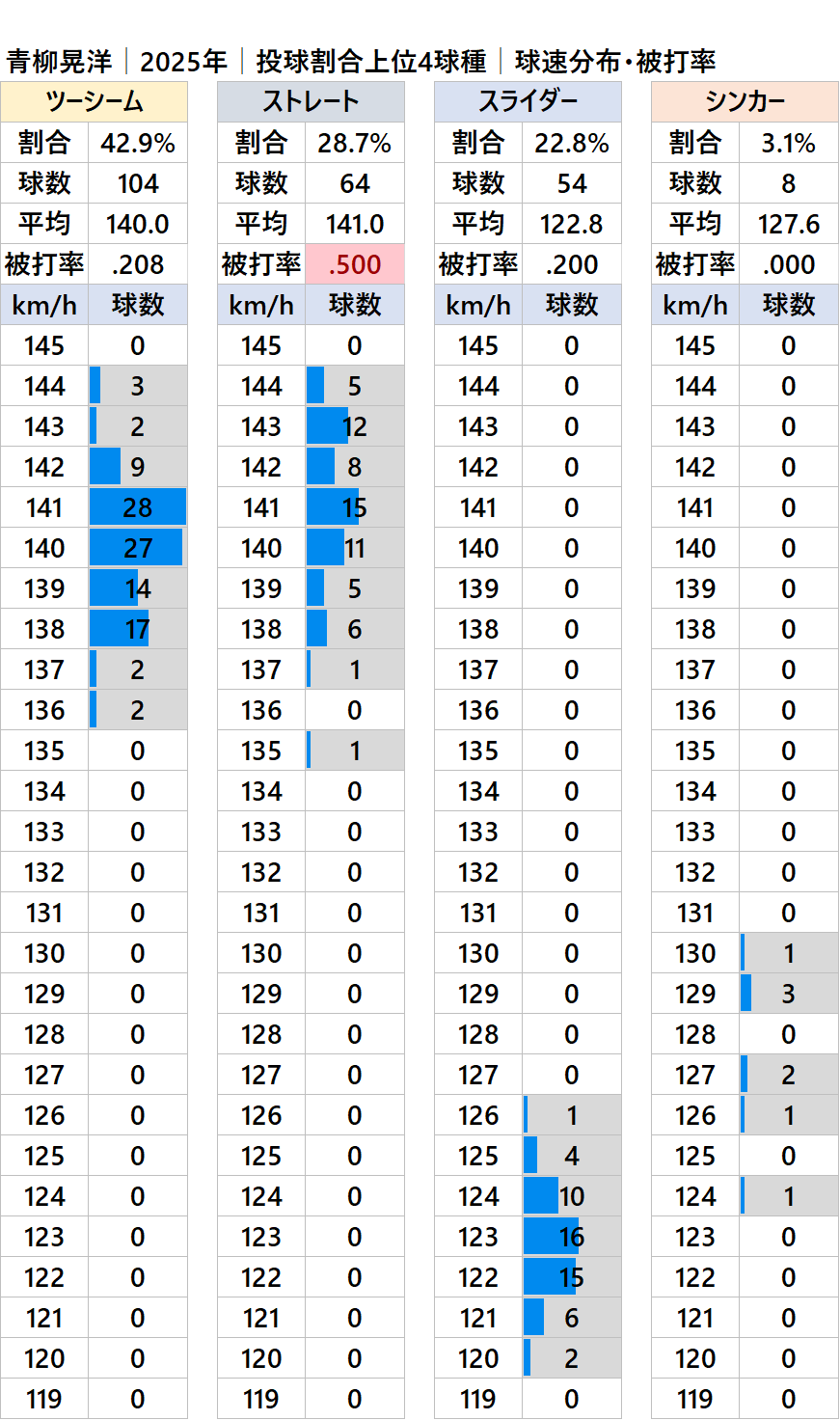 ヤクルトの青柳晃洋投手(右投)の2025年シーズンの球種別の投球割合・球速・被打率の情報です。