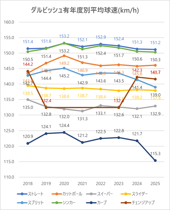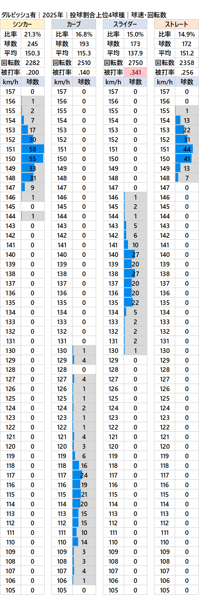 ダルビッシュ有投手の2025年シーズンの球速・球種・被打率・回転数の情報です。
