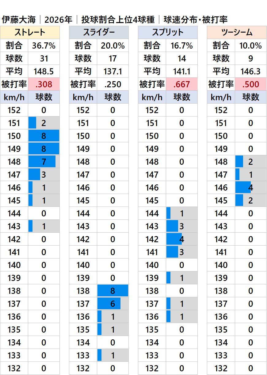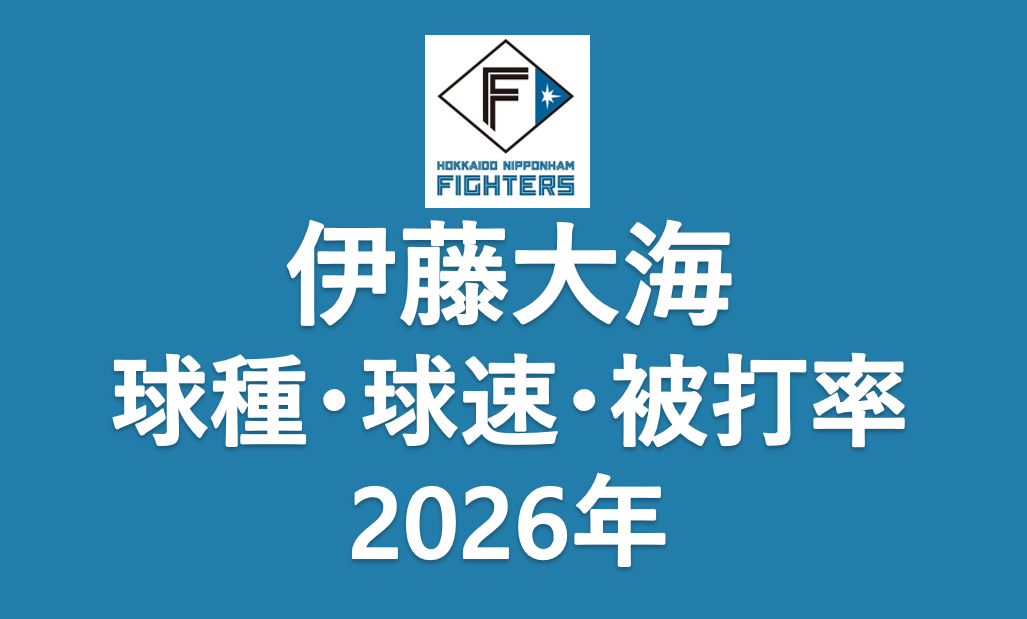 日本ハムの伊藤大海投手(右投)の2026年シーズンの球種別の投球割合・球速・被打率の情報です。