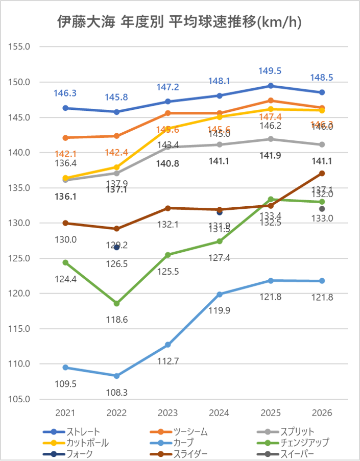 ストレートの平均球速は2025年と比較し1km/h低下。