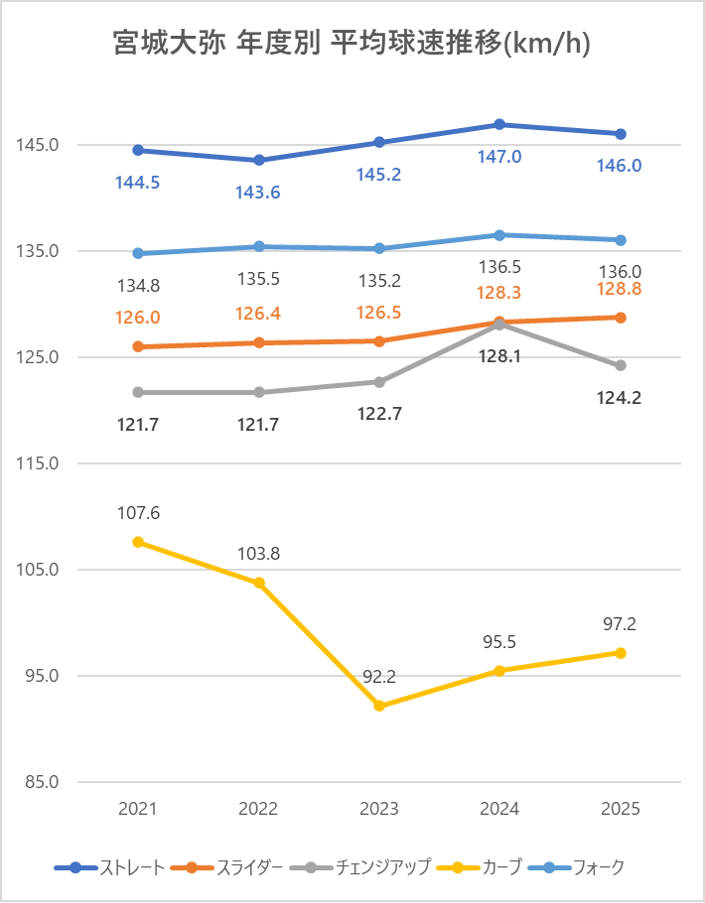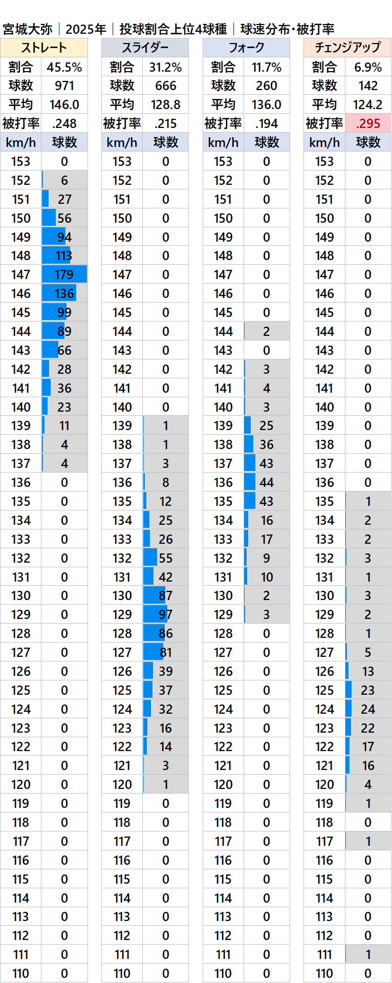 オリックスの宮城大弥投手の2025年シーズンの球速・球種・被打率の情報です。