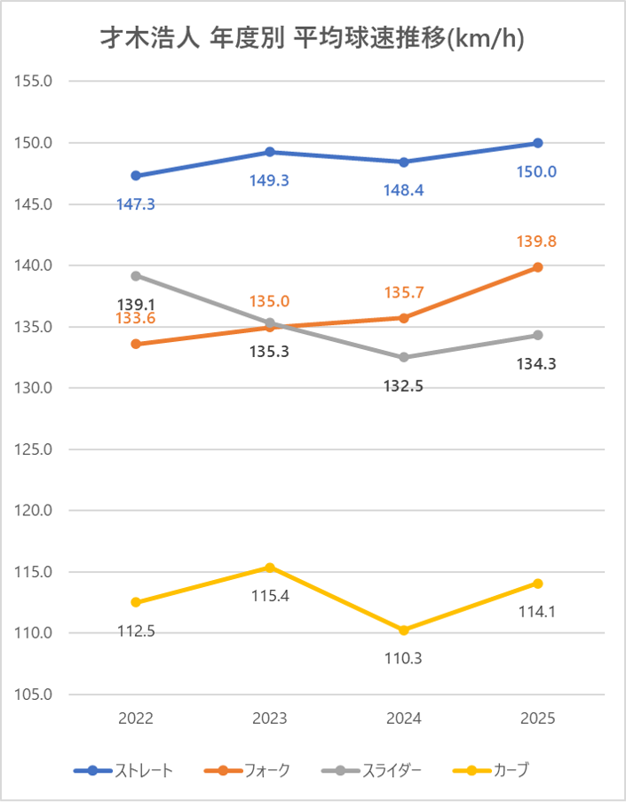 2024年と比較してストレートの平均球速は1.7km/h上昇。