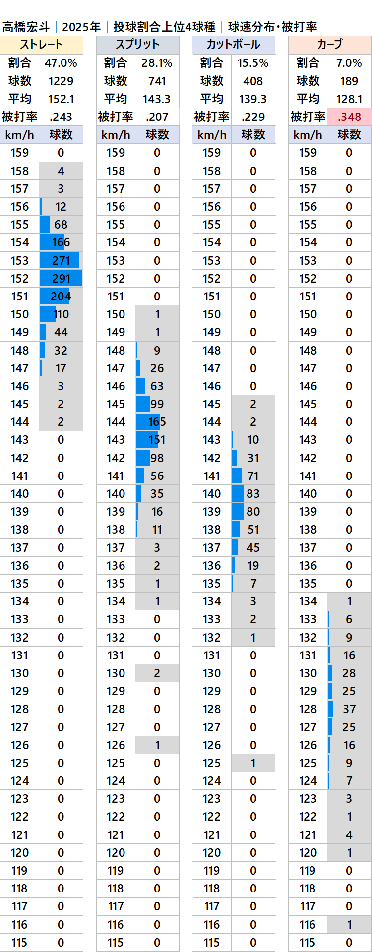 中日ドラゴンズの高橋宏斗投手の2025年シーズンの投球割合・球速・被打率の情報です。