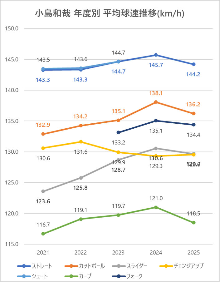 ストレートの平均球速は2024年と比較し1.5km/h低下。