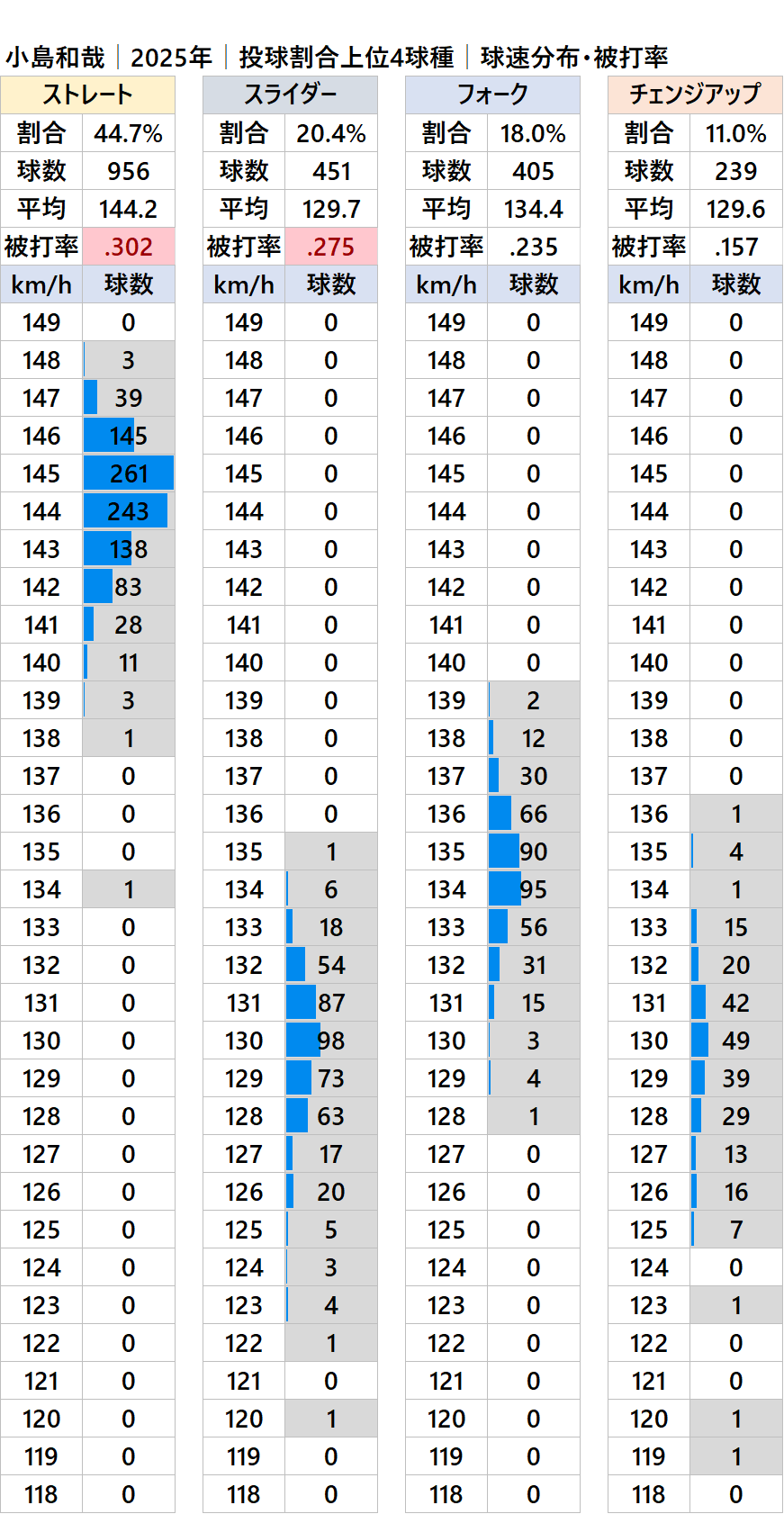 千葉ロッテの小島和哉投手の2025年シーズンの球種別の投球割合・球速・被打率の情報です。