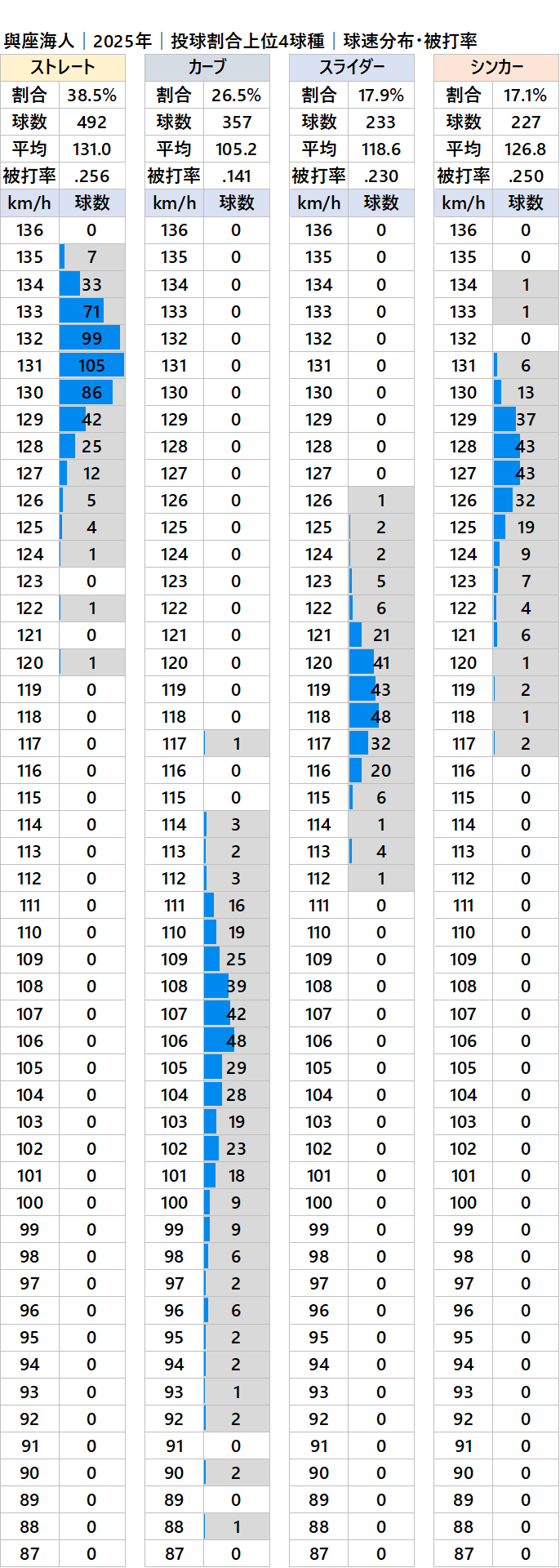 西武の與座海人投手の2025年シーズンの球種別の投球割合・球速・被打率の情報です。