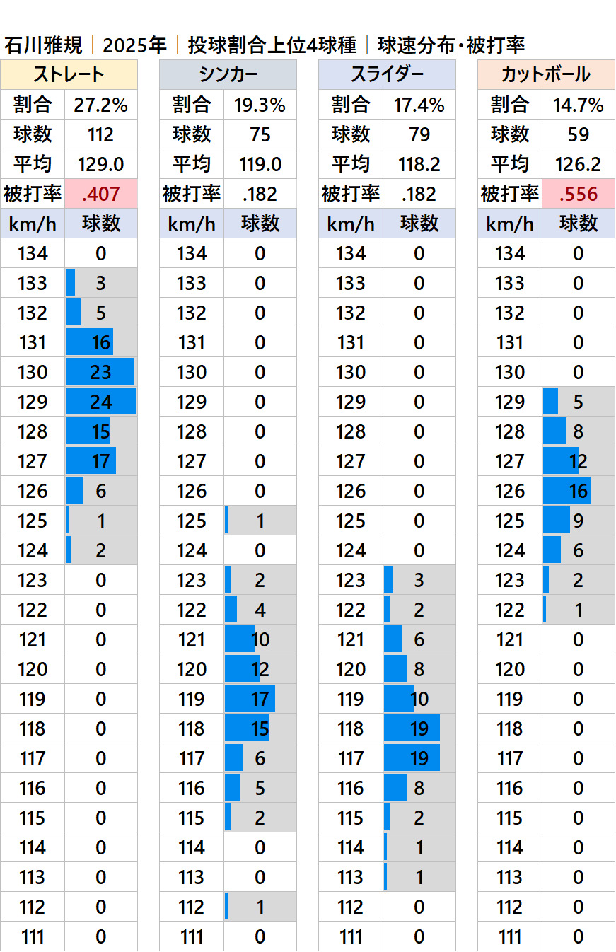 ヤクルトの石川雅規投手の2025年シーズンの球種別の投球割合・球速・被打率の情報です。