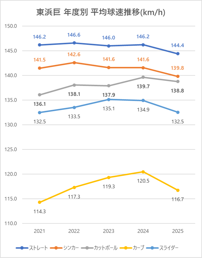 ストレートの平均球速は2024年と比較し1.8km/h低下。