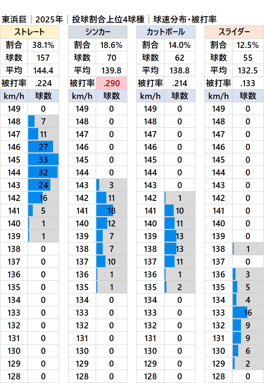 ソフトバンクの東浜巨投手の2025年シーズンの球種別の投球割合・球速・被打率の情報です。