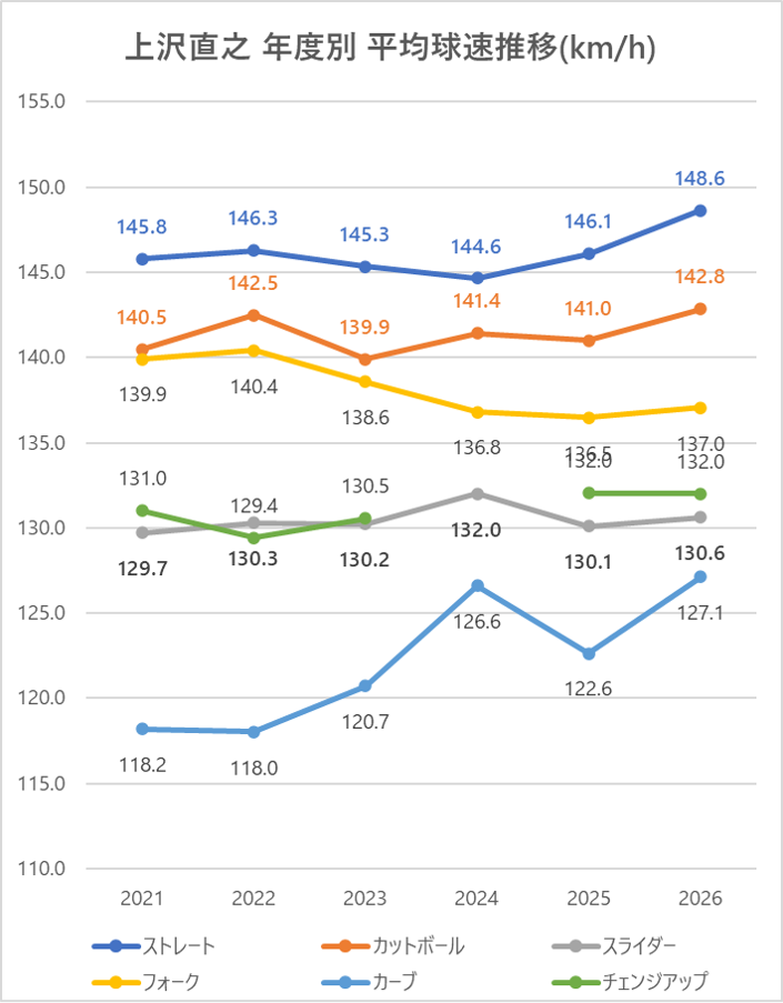 ストレートの平均球速は2025年と比較し2.5km/h上昇。