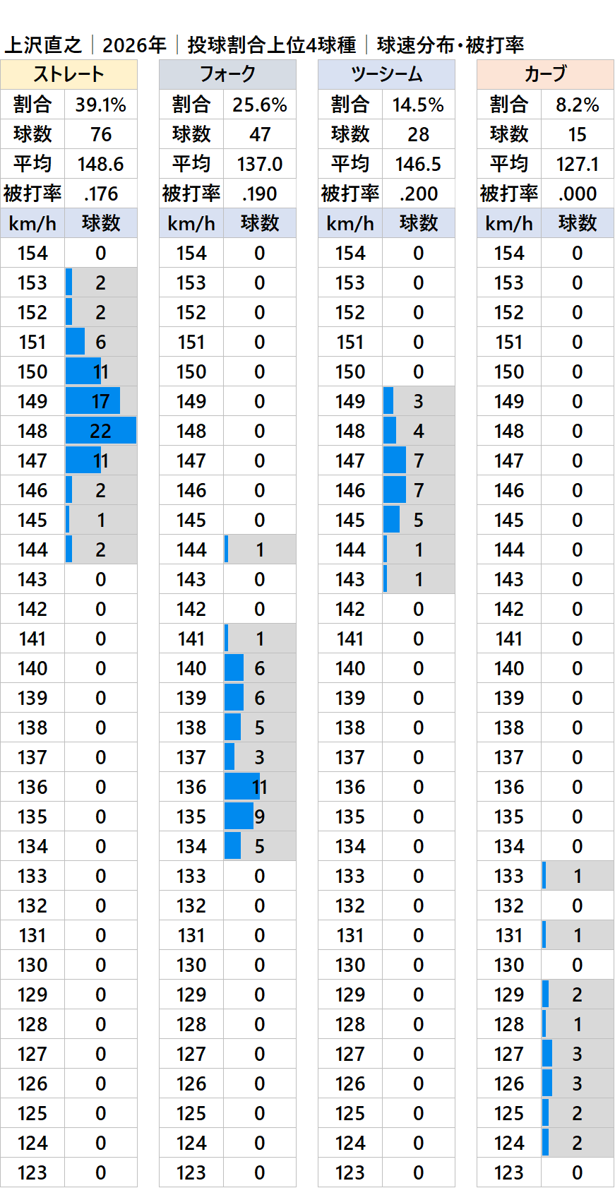 ソフトバンクの上沢直之投手(右投)の2026年シーズンの球種別の投球割合・球速・被打率の情報です。