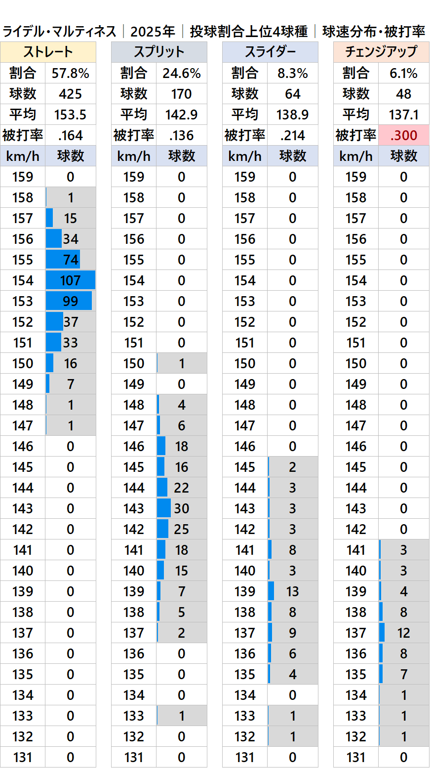 巨人のライデル・マルティネス投手の球種別の投球割合・球速・被打率の情報です。