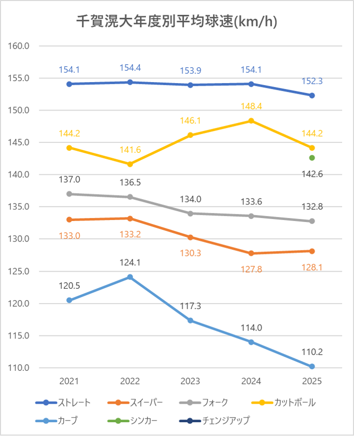 ストレート(4シーム)の平均球速は2024年と比較し1.8km/h低下。