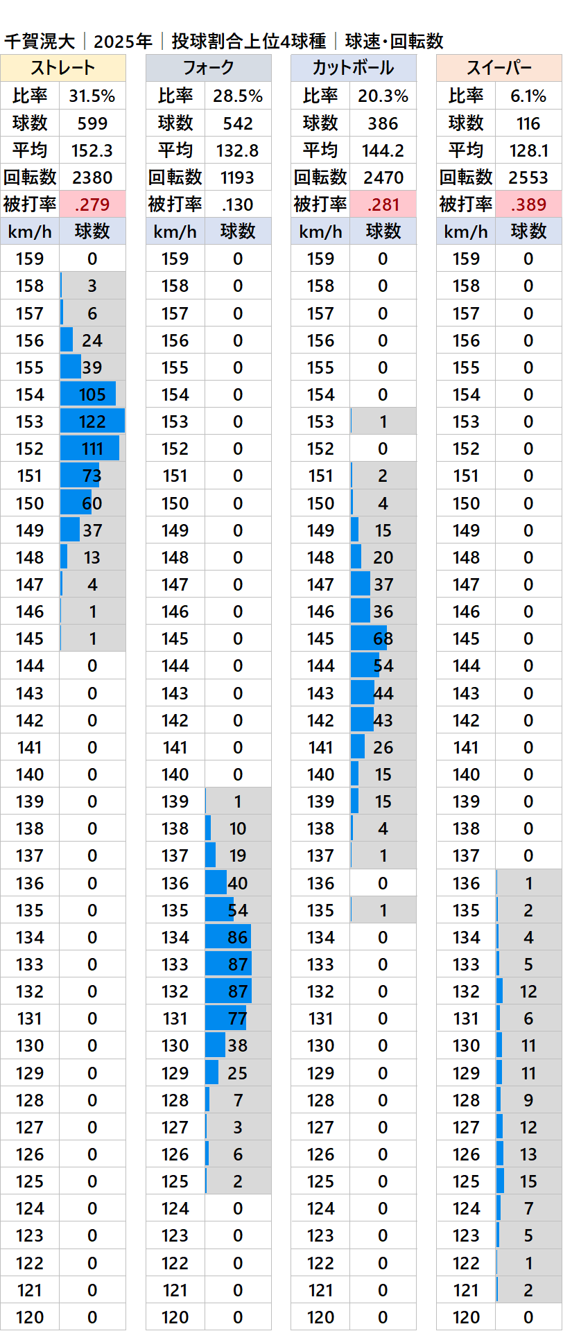 メッツの千賀滉大投手の2025年シーズンの球種別の投球割合・球速・被打率・回転数の情報です。