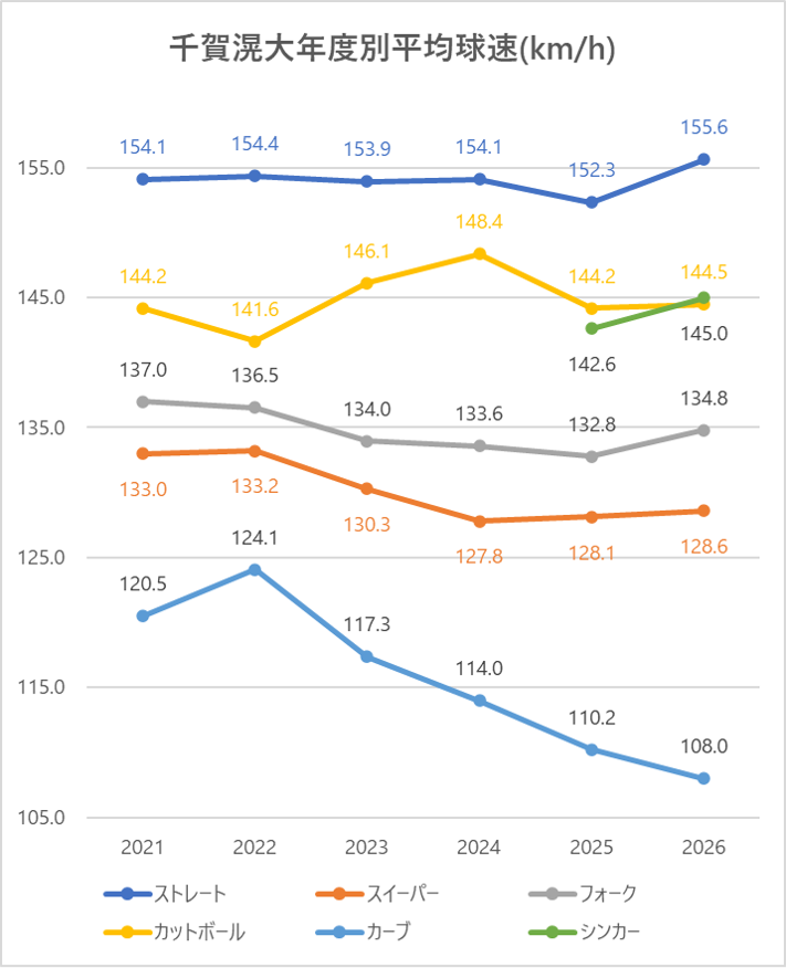 ストレート(4シーム)の平均球速は2025年と比較し3.3km/h上昇。