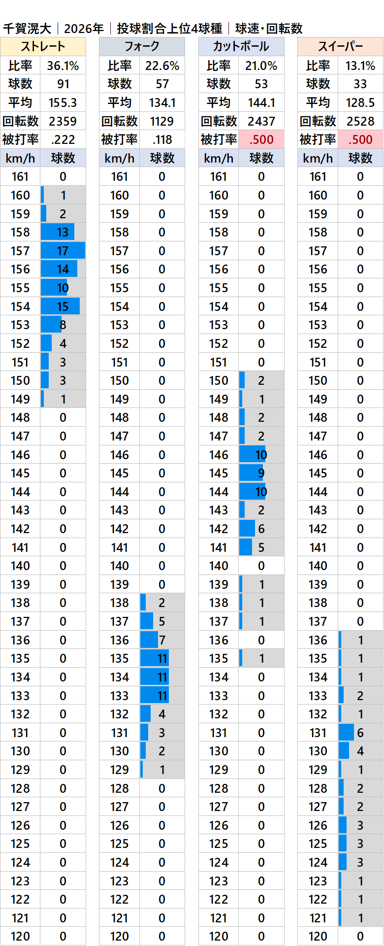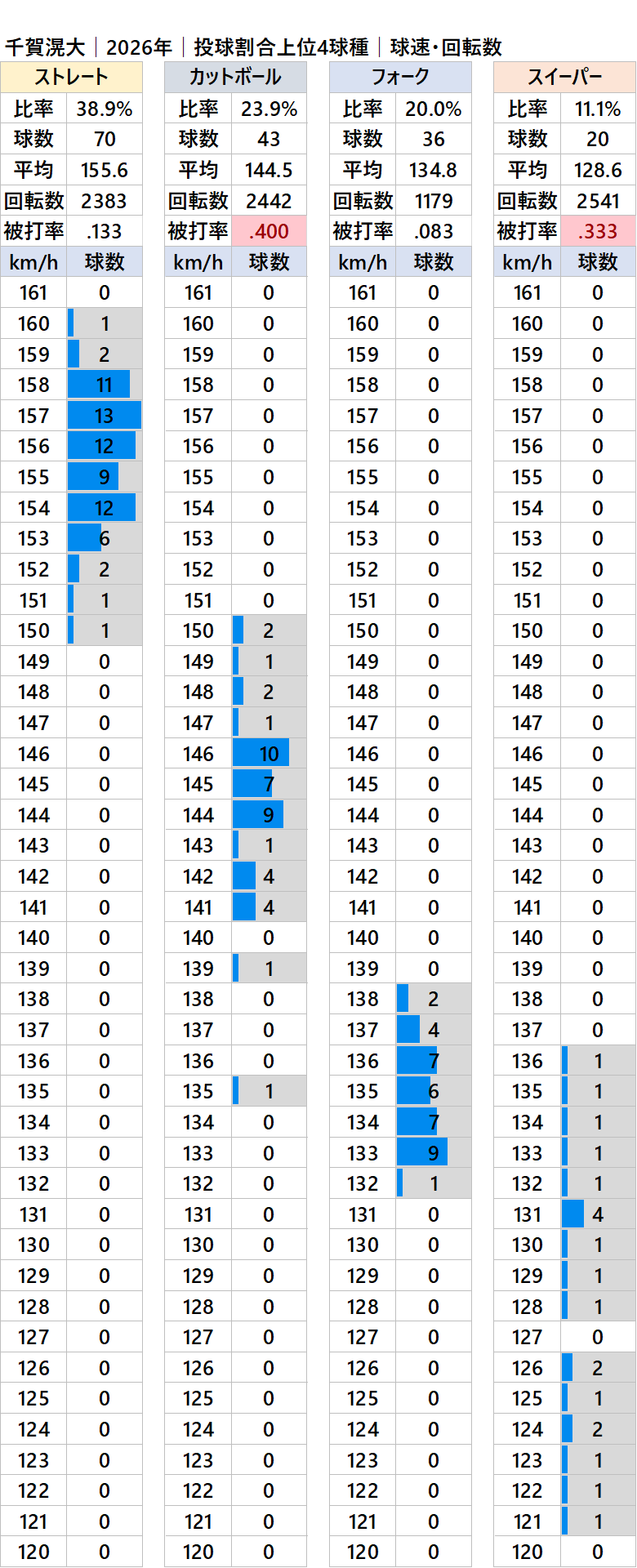 球種別球速・投球割合・被打率・回転数