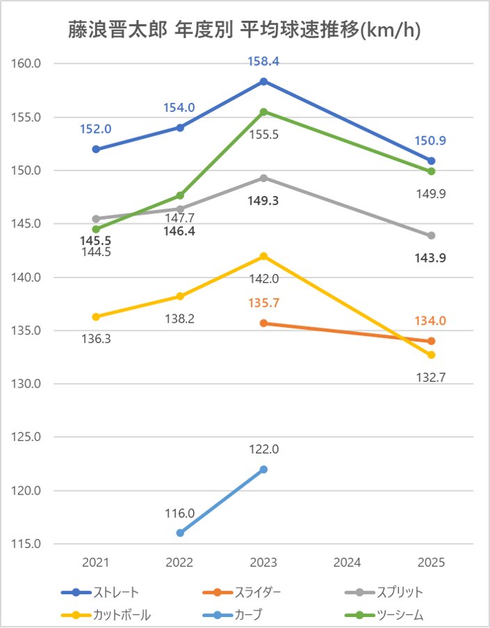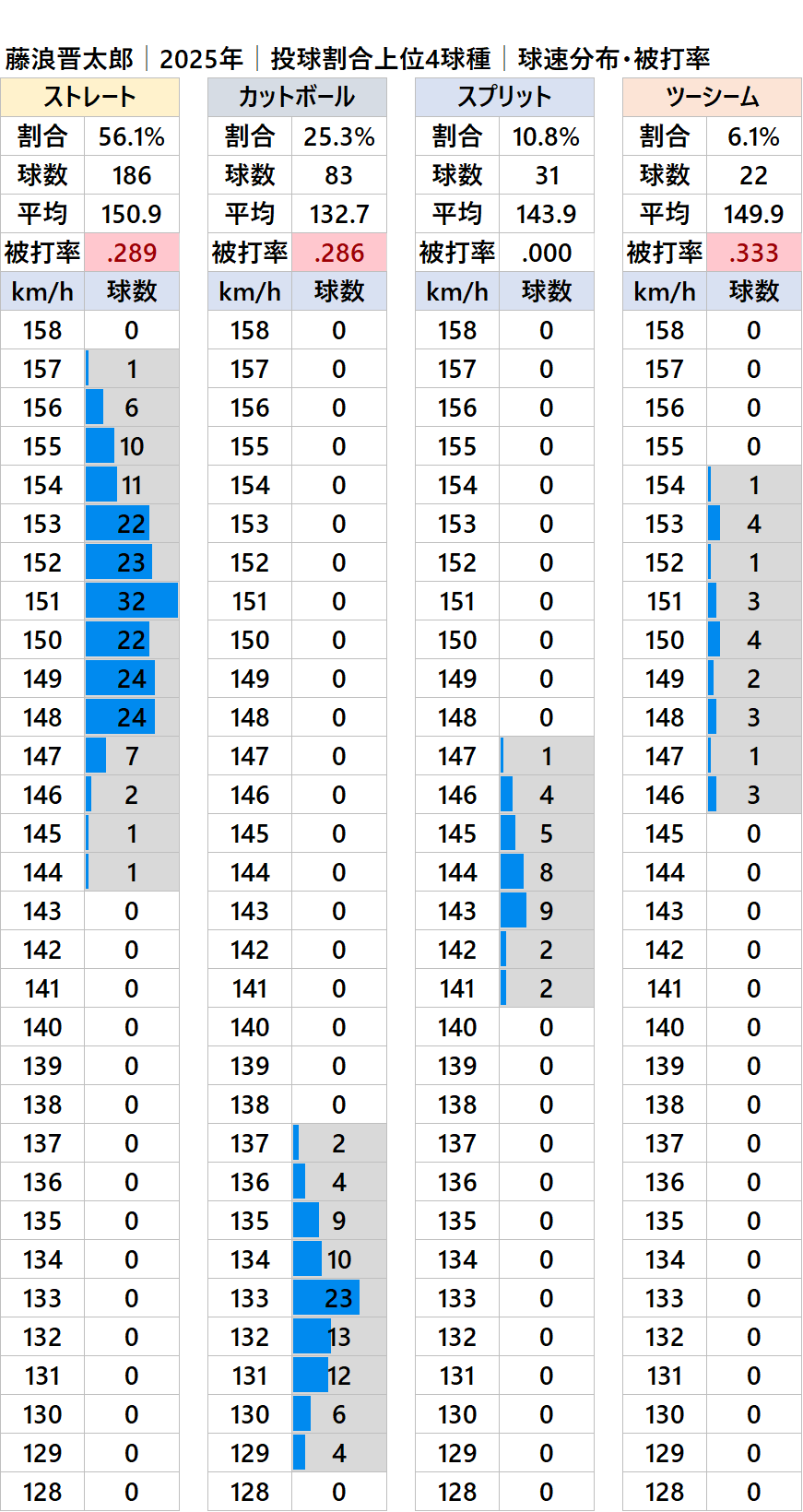 DeNAの藤浪晋太郎投手の2025年シーズンの投球割合・球速・被打率の情報です。