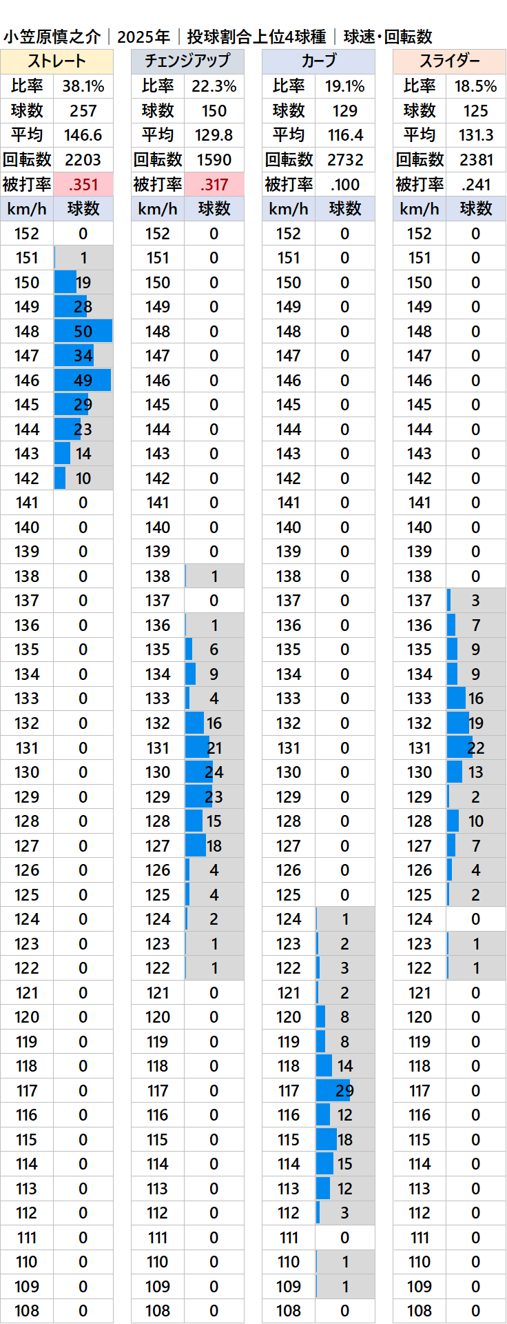 ナショナルズの小笠原慎之介投手の2025年シーズンの投球割合・球速・被打率・回転数の情報です。