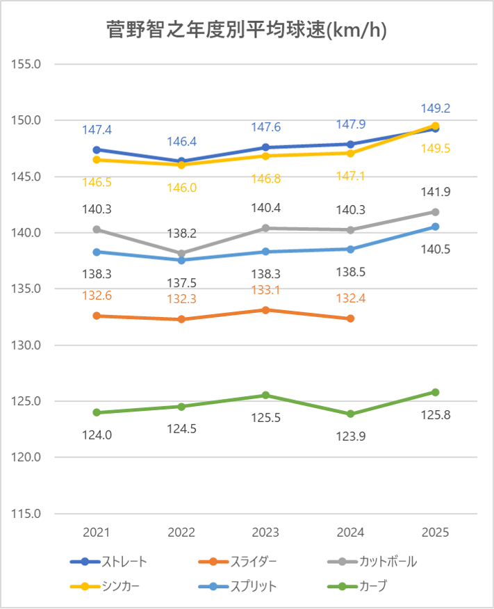ストレートの平均球速は巨人に在籍した2024年と比較し1.3km/h上昇。