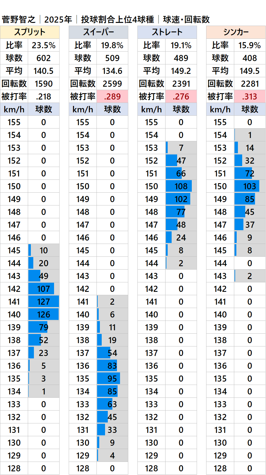 オリオールズの菅野智之投手の2025年シーズンの球種別の投球割合・球速・被打率・回転数の情報です。
