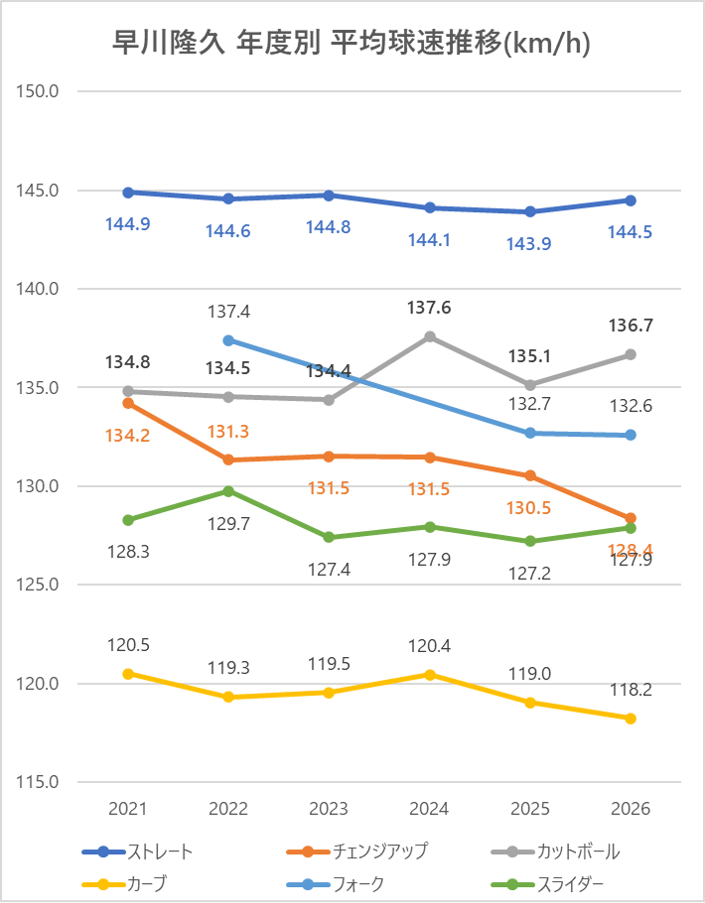 2025年と比較しストレートの平均球速は0.6km/h上昇。