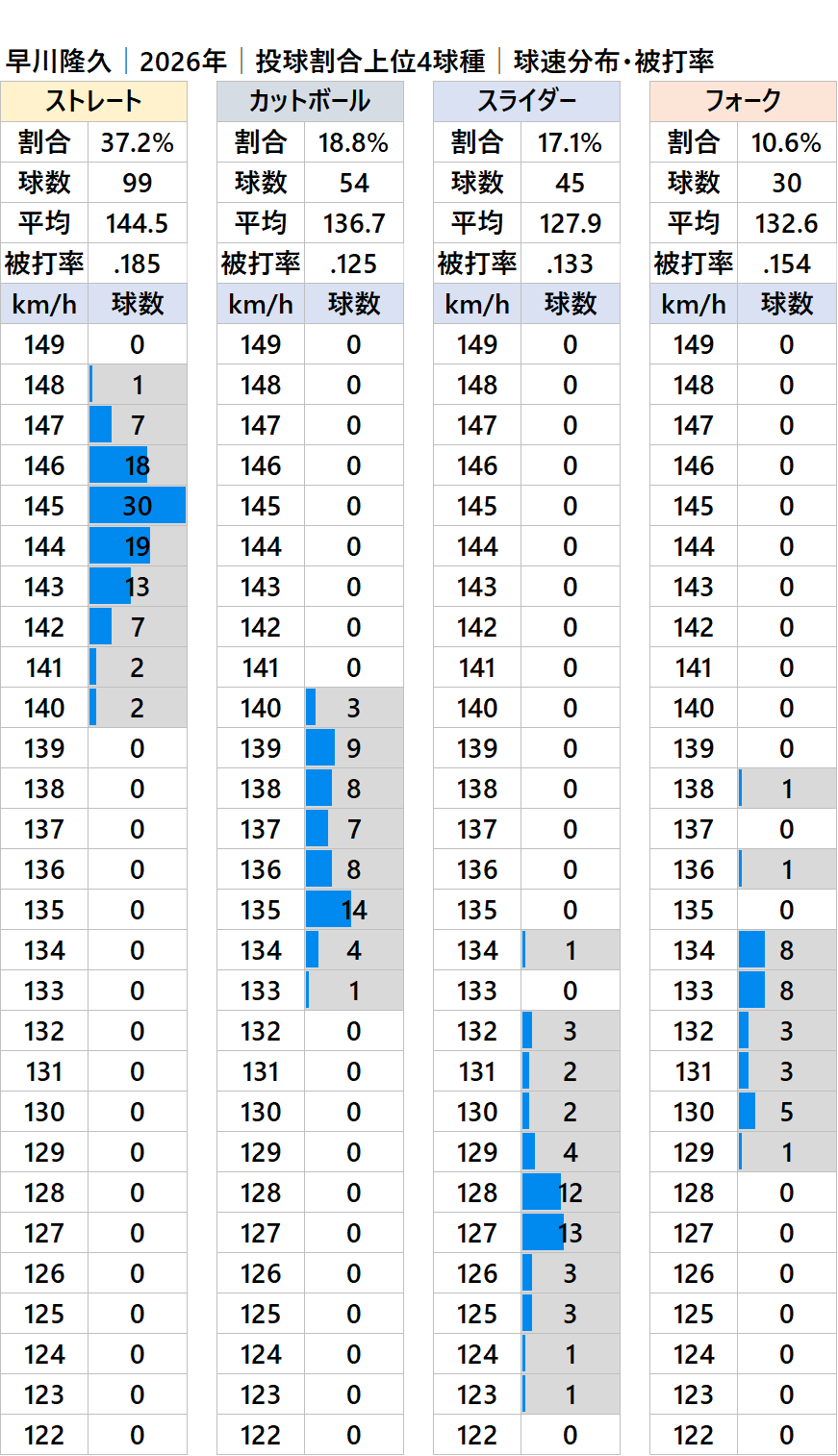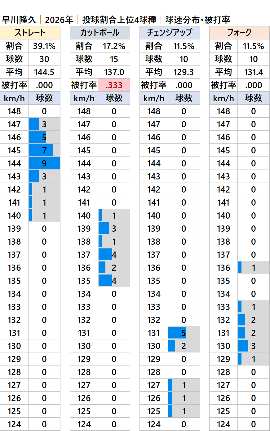 楽天の早川隆久投手(左投)の2026年シーズンの球種別の投球割合・球速・被打率の情報です。