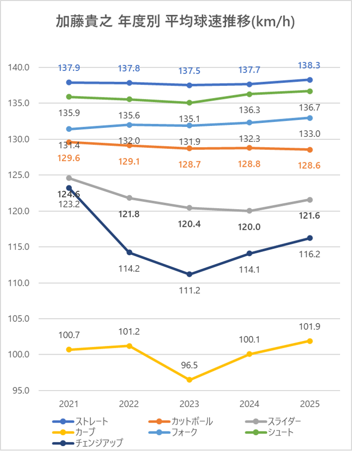 ストレートの平均球速は2024年と比較し0.6km/h上昇。