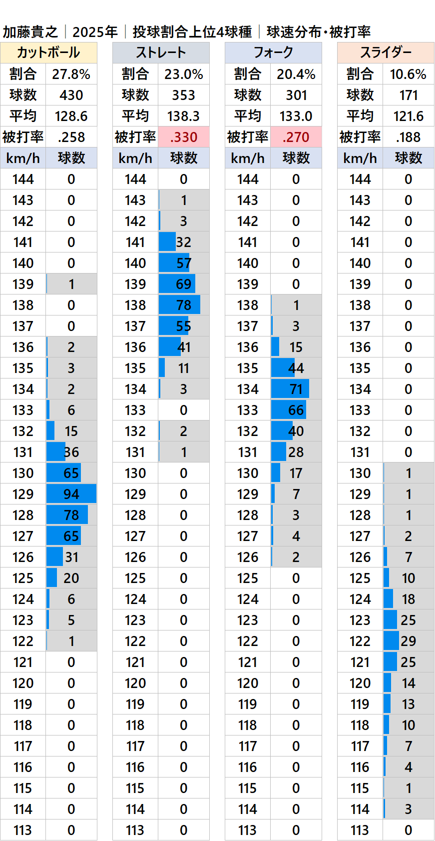 加藤貴之投手|球速・球種・被打率│2025│球速ドットコム