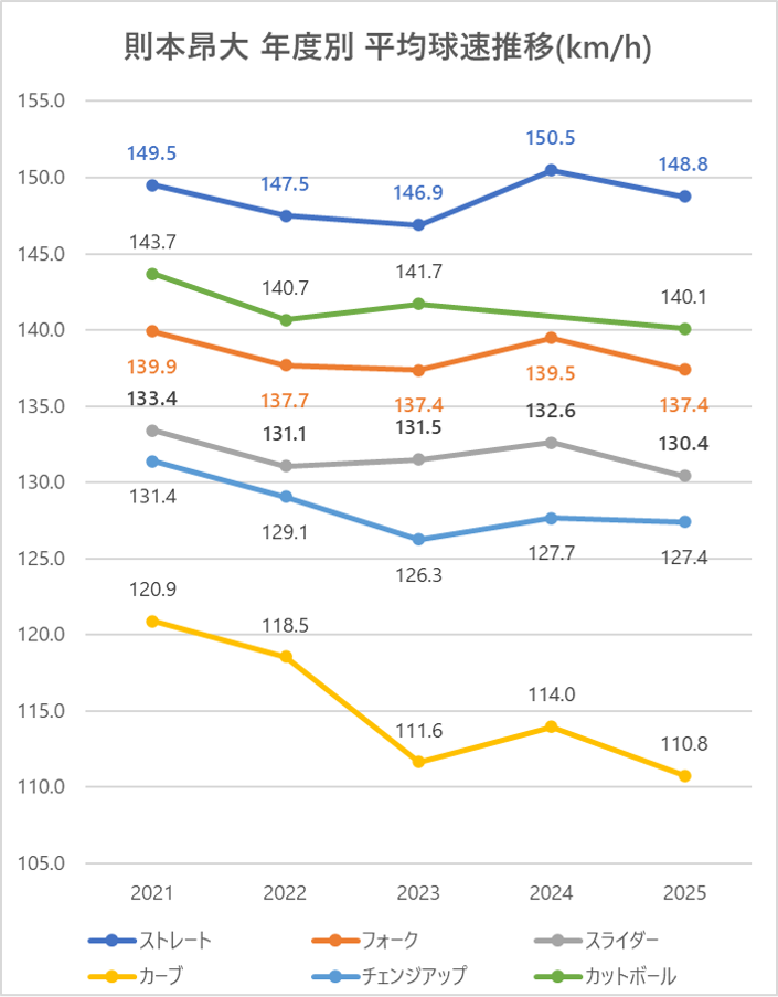 ストレートの平均球速は2024年と比較し1.7km/h低下。