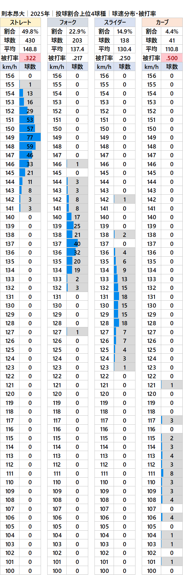 楽天の則本昂大投手(右投)の2025年シーズンの球種別の投球割合・球速・被打率の情報です。