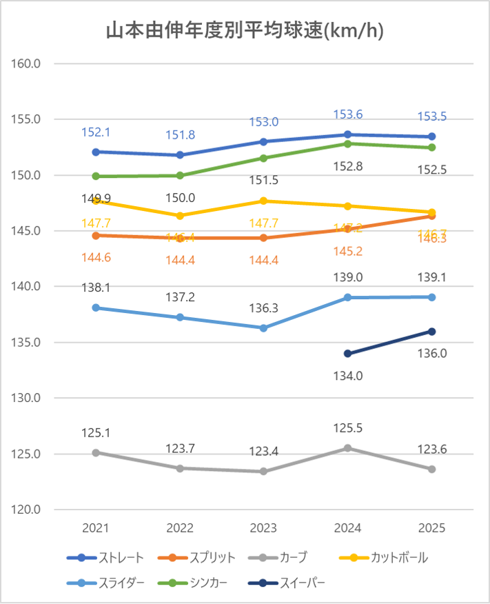 ストレートの平均球速は2024年と比較し横ばい。