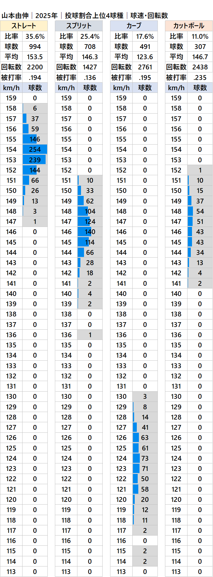 ドジャースの山本由伸投手の2025年シーズンの球種別の投球割合・球速・被打率・回転数の情報です。