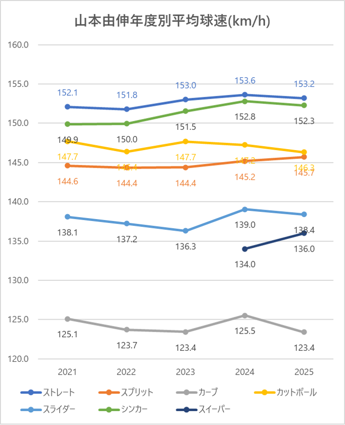 ドジャースの山本由伸投手の2025年シーズンの球種別の投球割合・球速・被打率・回転数の情報です。