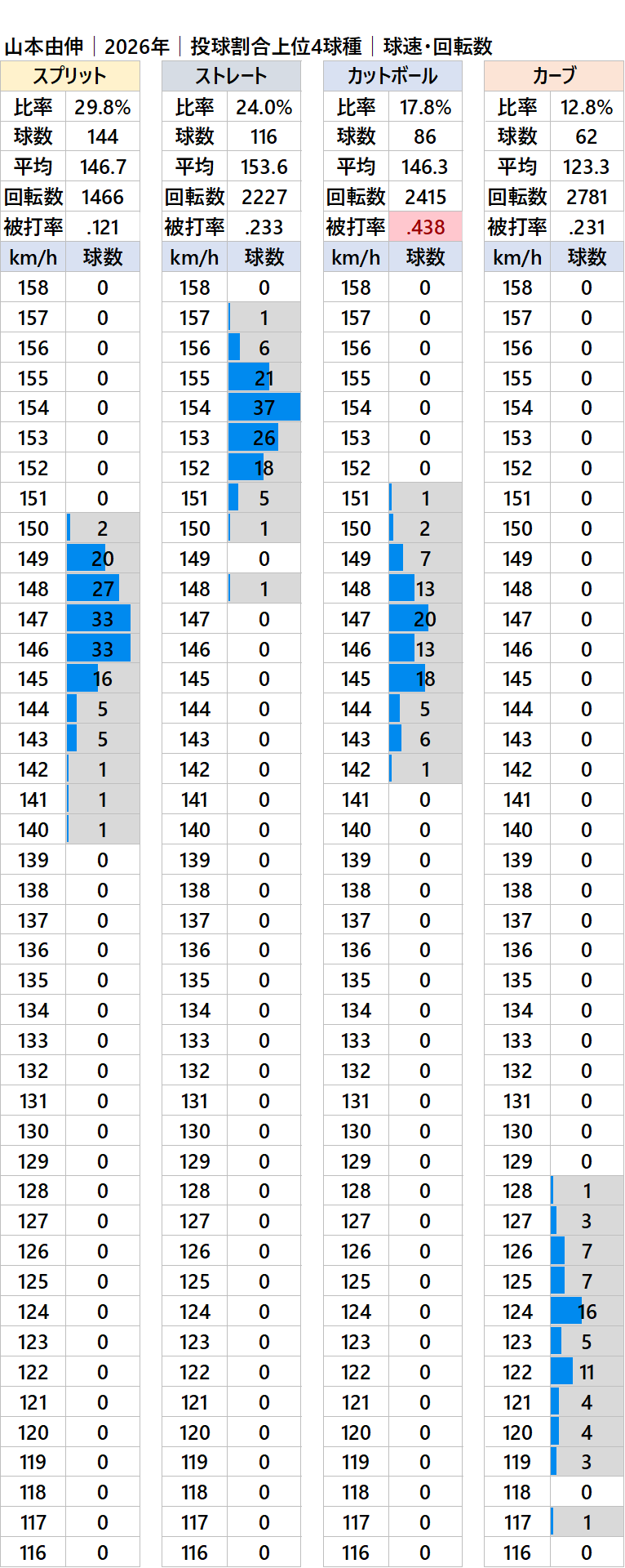 ドジャースの山本由伸投手(右投)の2026年シーズンの球種別の投球割合・球速・被打率・回転数の情報です。