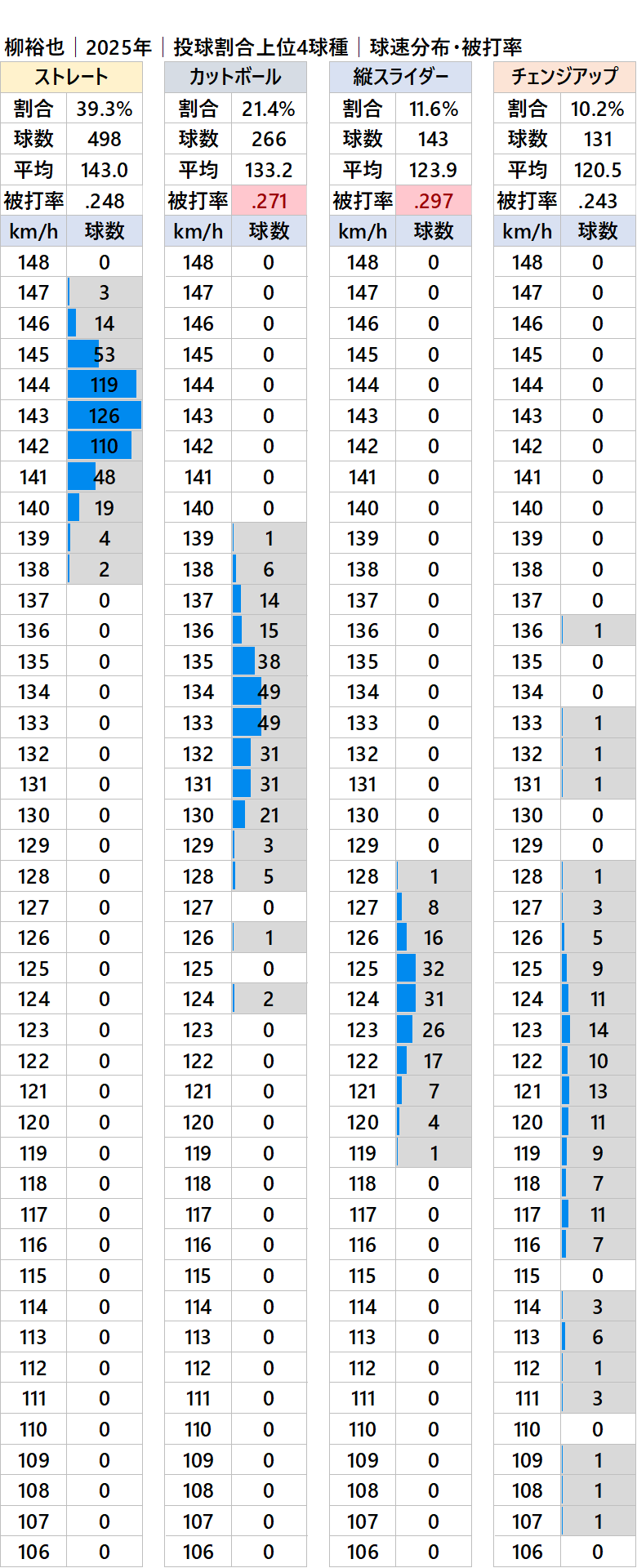 中日の柳裕也投手の2025年シーズンの球種別の投球割合・球速・被打率の情報です。