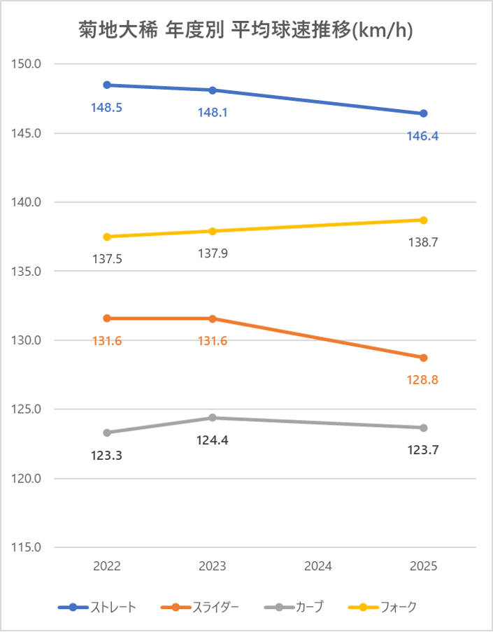 2023年と比較しストレートの平均球速は1.7km/h低下。