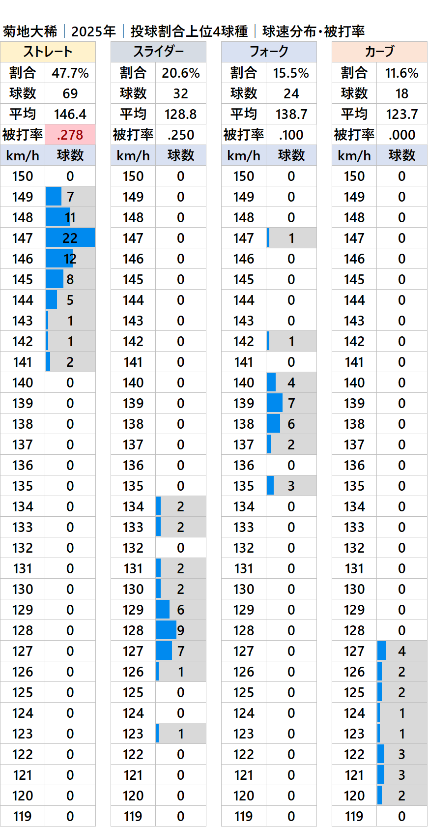 巨人の菊地大稀投手(右投)の2025年シーズンの球種別の投球割合・球速・被打率の情報です。