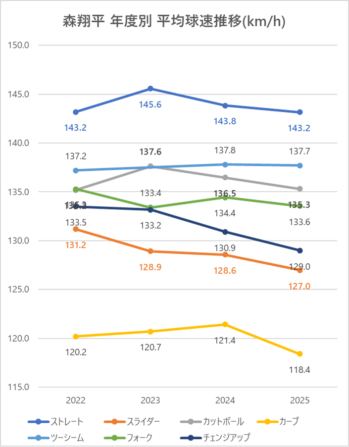 2024年と比較しストレートの平均球速は0.6㎞/h低下。