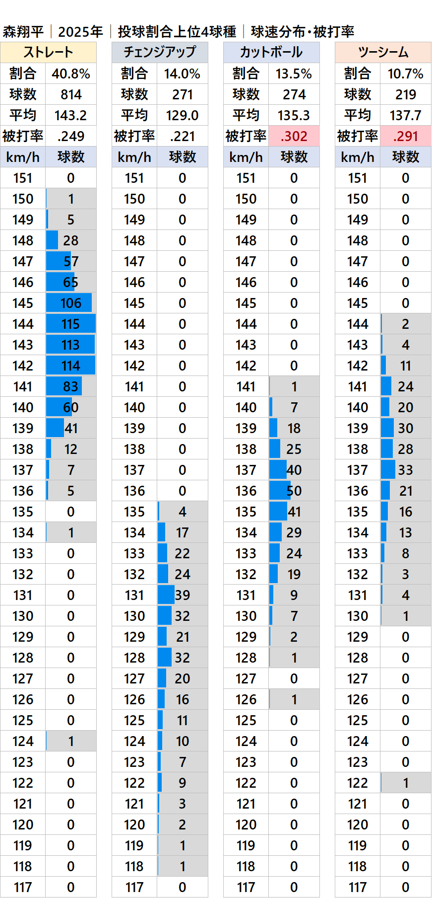 広島の森翔平投手の2025年シーズンの球種別の投球割合・球速・被打率の情報です。
