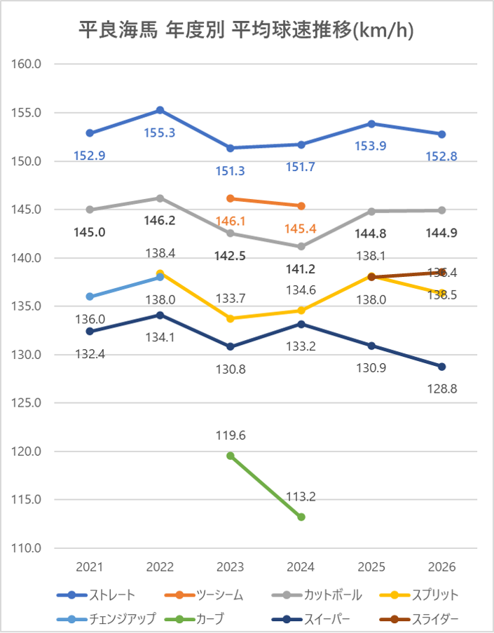 2025年と比較してストレートの平均球速は約1km/h低下。