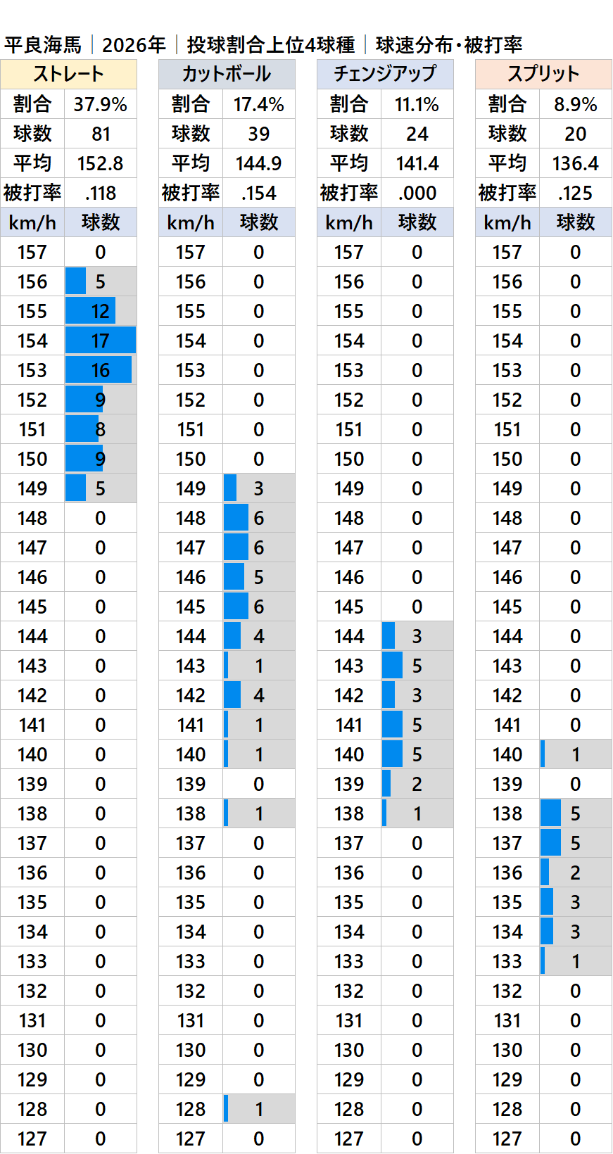 西武の平良海馬投手(右投)の2026年シーズンの球種別の投球割合・球速・被打率の情報です。
