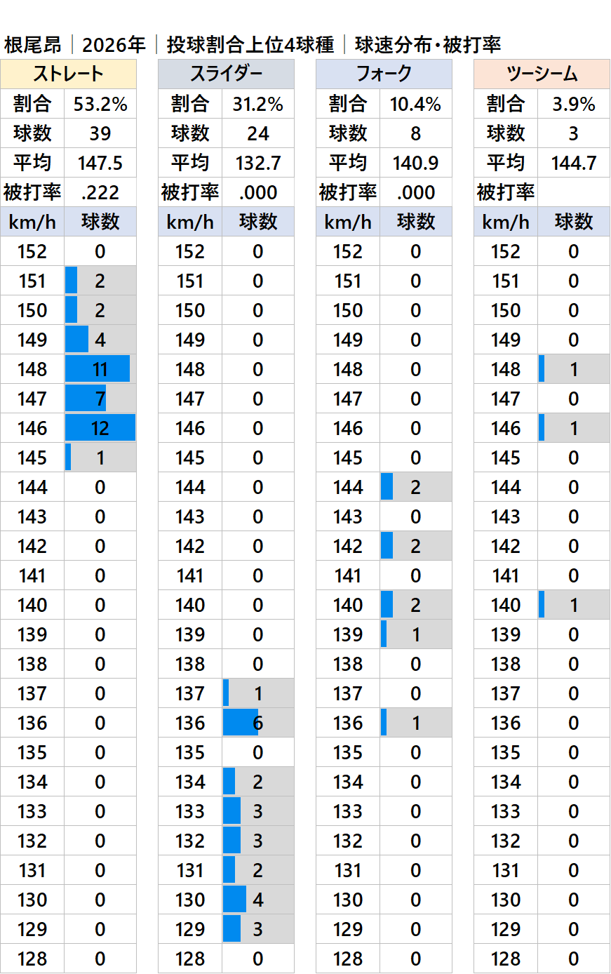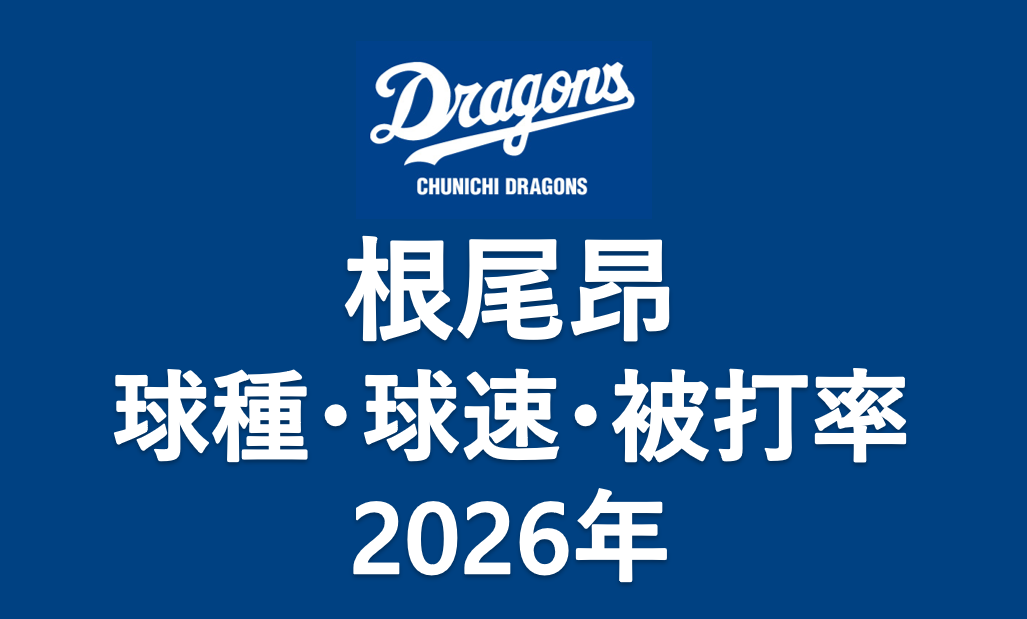 中日の根尾昂投手(右投)の2026年シーズンの球種別の投球割合・球速・被打率の情報です。