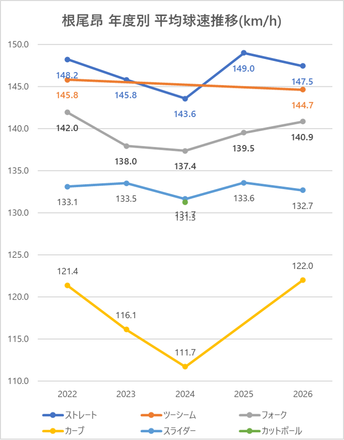 2025年と比較しストレートの平均球速は1.5km/h低下。