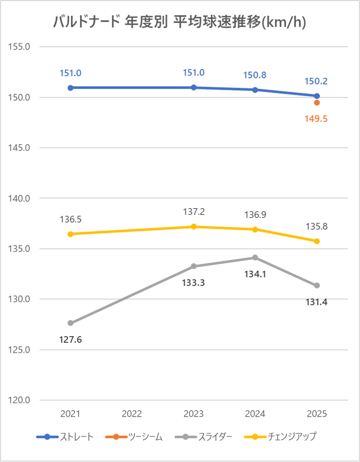 ストレートの平均球速は2024年と比較し0.6km/h低下。