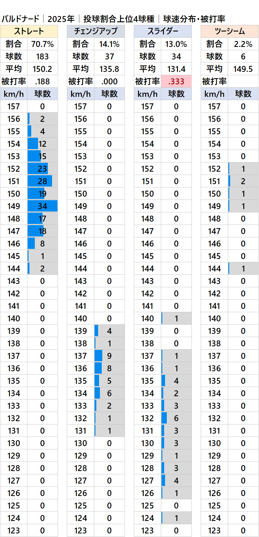 巨人のバルドナード投手の2025年シーズンの球種別の投球割合・球速・被打率の情報です。