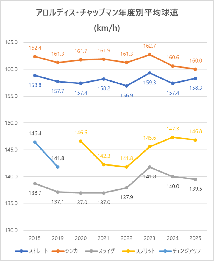 シンカー(2シーム)の平均球速は2024年と比較し0.6km/h低下。