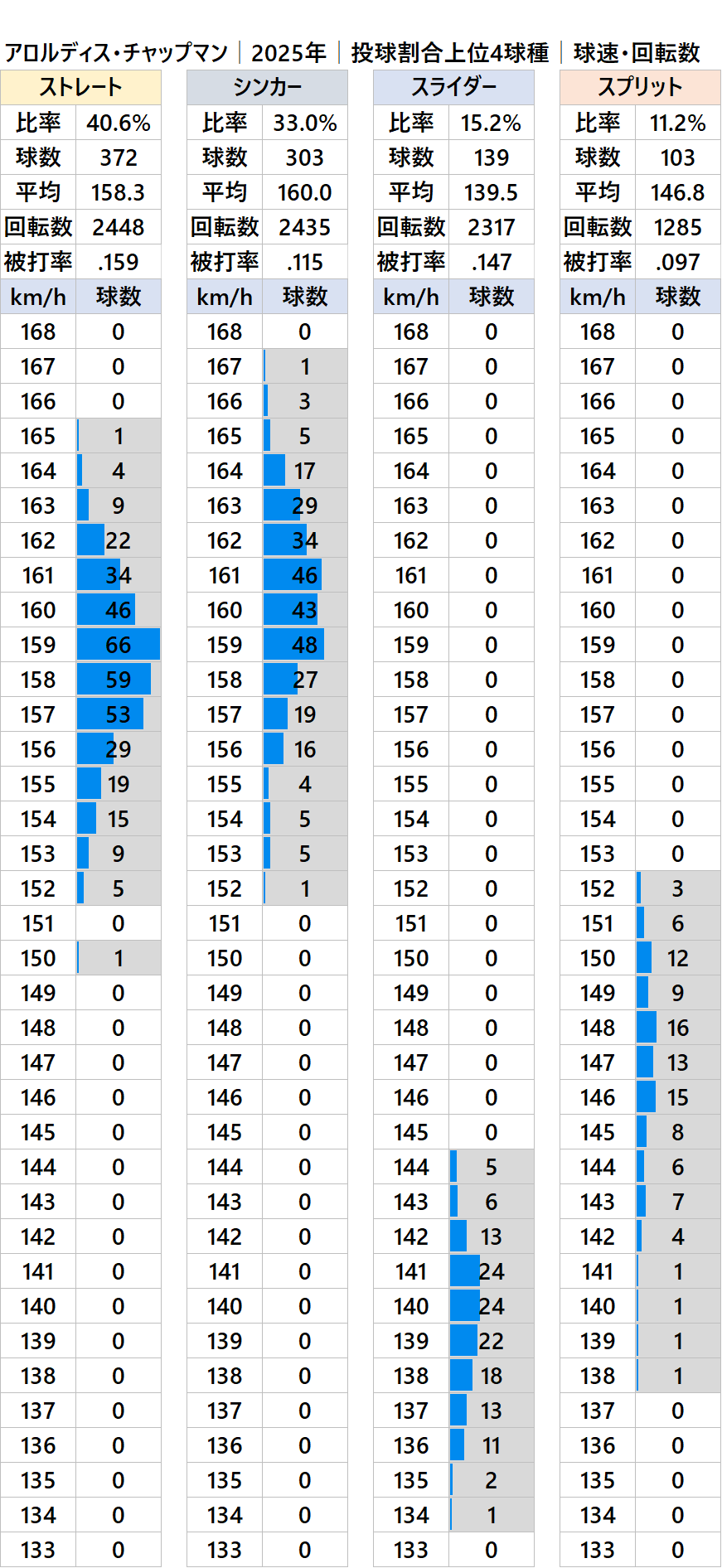 レッドソックスのアロルディス・チャップマン投手の2025年シーズンの球種別の投球割合・球速・回転数・被打率の情報です。