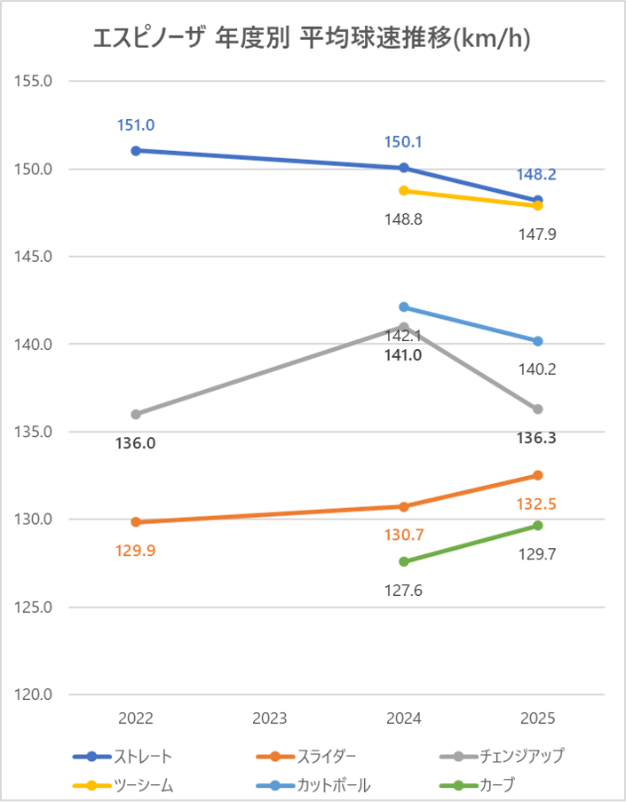 2024年と比較しツーシームの平均球速は0.9km/h低下。