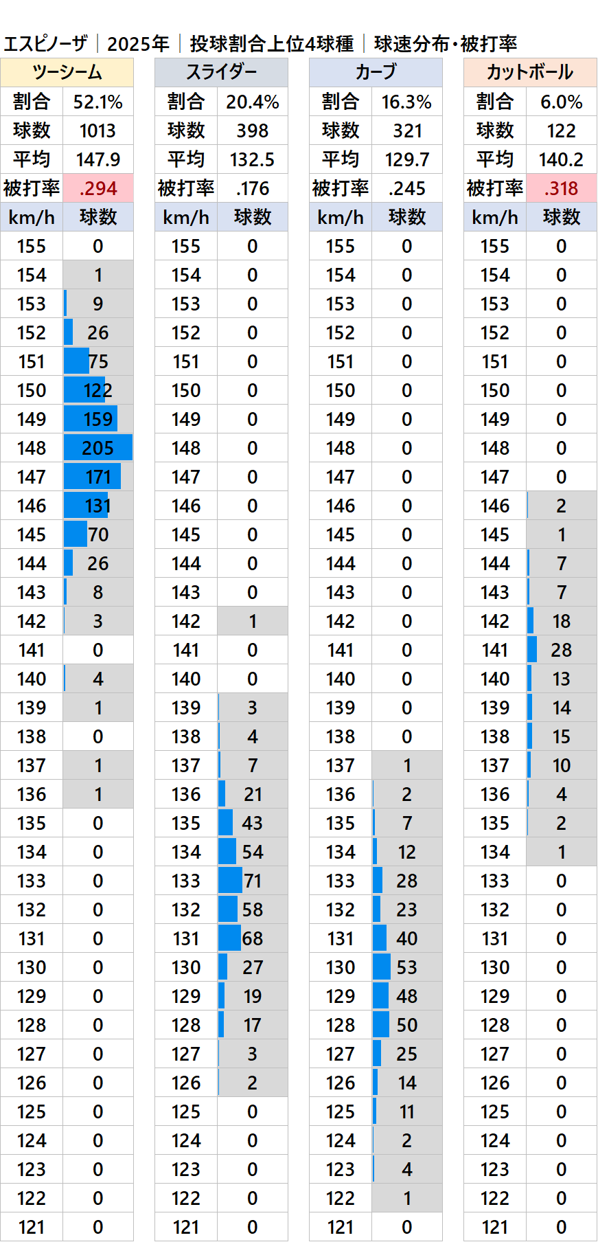 オリックスのエスピノーザ投手の2025年シーズンの球種別の投球割合・球速・被打率の情報です。